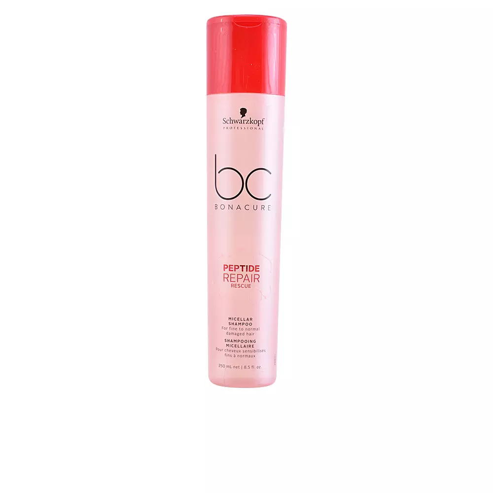 BC PEPTIDE REPAIR RESCUE micellar shampoo fine hair by SCHWARKOPF. Repairing shampoo indicated for fine hair that is damaged, dull and prone to porosity that have been treated with chemical treatments or have used a lot of iron and dryer. Its micellar formula makes it a gentle hair care product. BC PEPTIDE REPAIR RESCUE micellar shampoo fine hair improves elasticity, seals the cuticle and provides additional hydration helping to repair the hair structure.