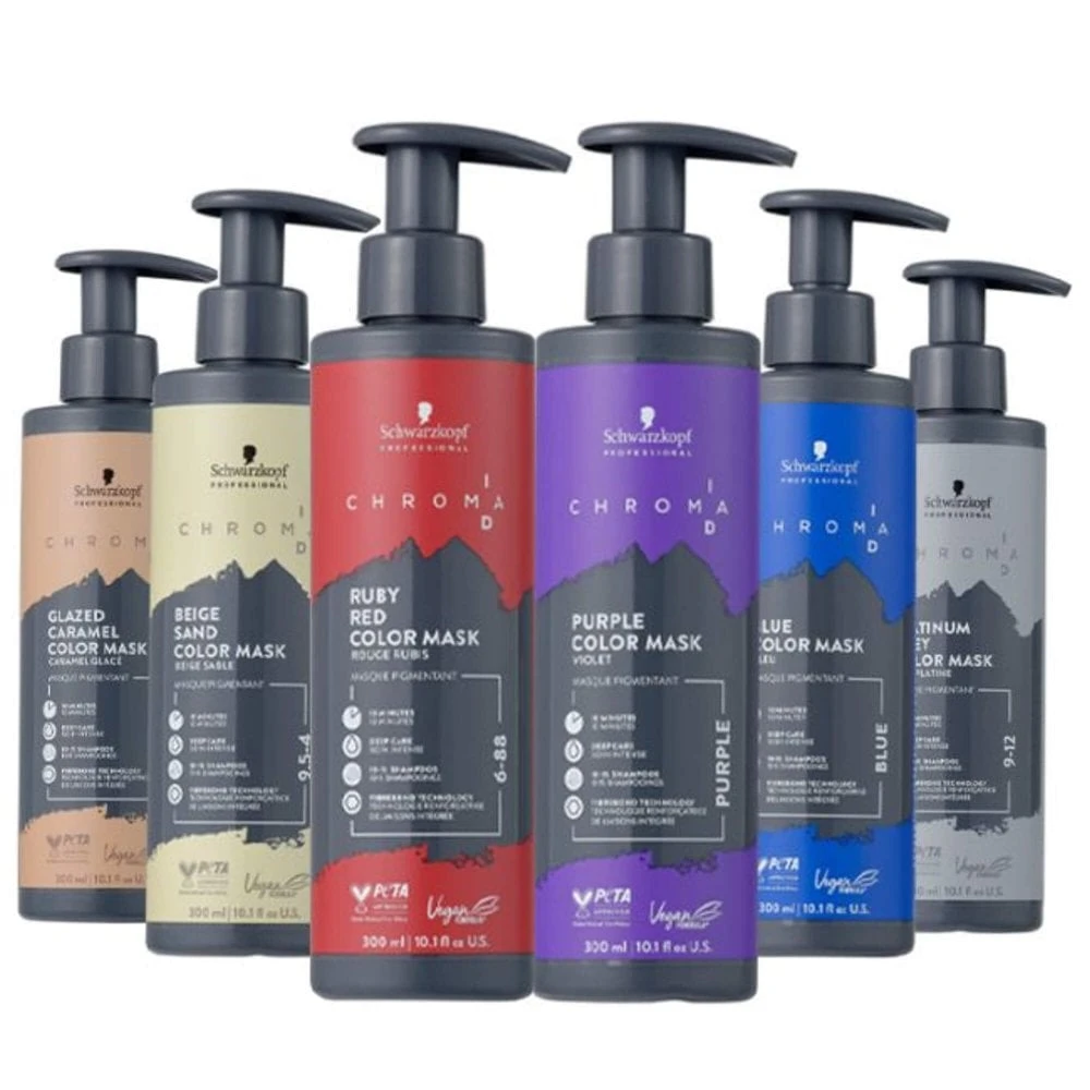 Schwarzkopf Chroma ID is a semi-permanent mix and tone colour system with integrated bonding technology. From subtle to bold shades, for 100% colour flexibility without damage. Chroma ID Bonding Color Masks are perfect for low commitment colour services, to refresh dull mid-lengths and ends, to increase longevity of Igora Royal and Igora Vibrance colours, to recover vibrancy and to keep optimal hair condition. Colour & Care in 1 Step: Combining high performing colour with intense care: the treatment based colour allows for simple, quick and perfectly even colour distribution while the integrated bonding technology deeply conditions the hair from within. 100% Colour Flexibility: The customisable mix and tone system provides infinite mixing opportunities, from bold and creative, colour refreshment, to pastel or neutralisation services. Direct Useage: All shades can be applied directly: no pre-mixing necessary, for minimum time investment and maximum efficiency! Longevity: Depending on shade selection, development time and hair structure, colour lasts up to 12 washes. Technology: The low salt technology leads to maximum pigment availability in the hair for enhanced colour results while the integrated bonding technology enforces structural bonds in the hair shaft for increased hair strength.