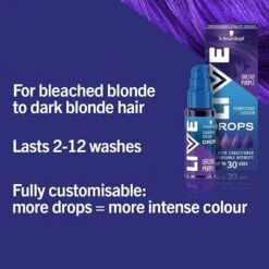 LIVE Colour Drops are a range of temporary customisable colours suitable for bleach blonde to dark blonde hair. The formula is highly pigmented and can be used to boost colour or create a temporary hue. Simply mix with conditioner for a customisable intensity.